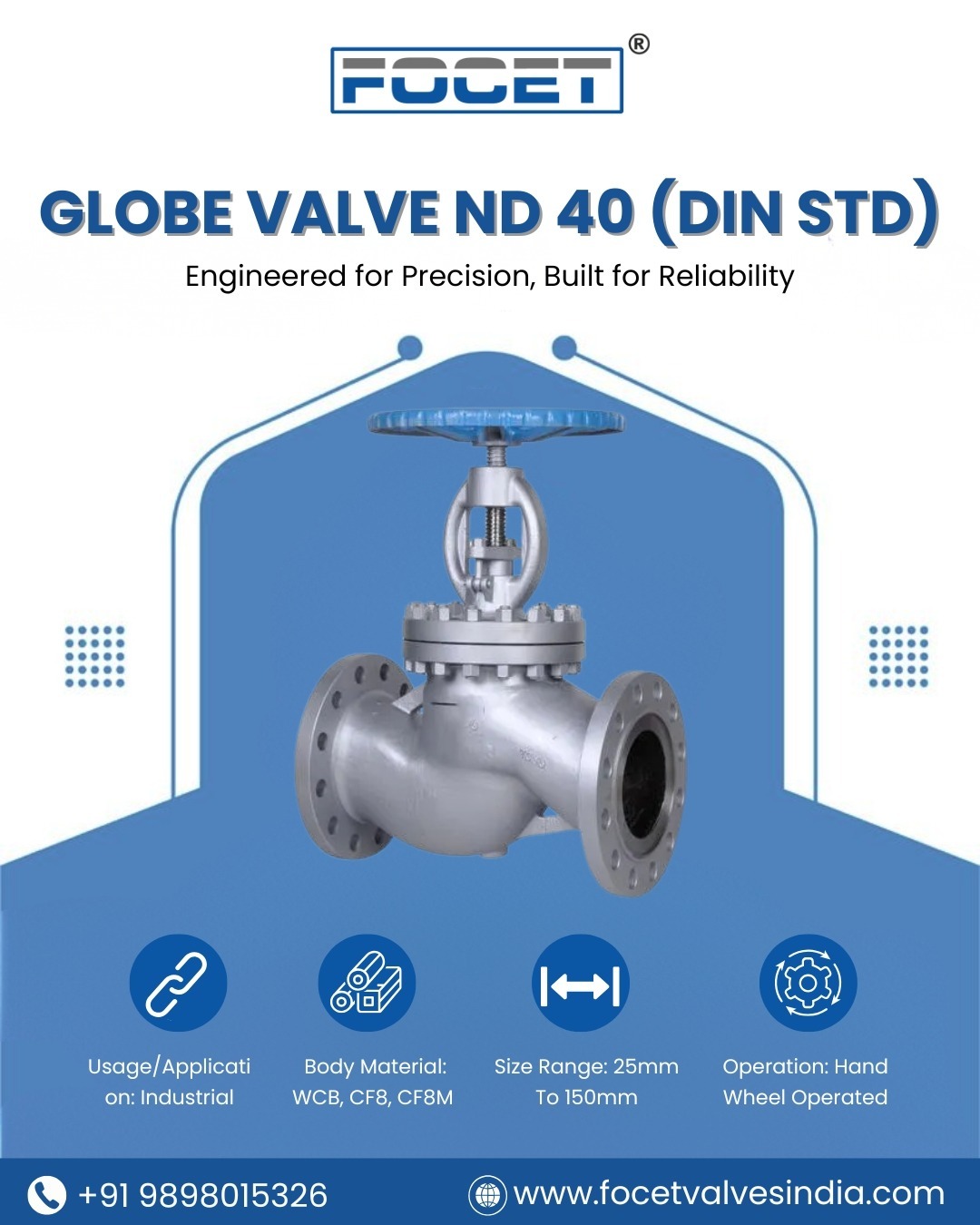 #GlobeValve #IndustrialValves #FocetValves #GlobeValveND40 #ValveManufacturer #Ahmedabad #GujaratIndustry #DINStd #FlowControl #BS1873 #IndustrialEquipment #OilAndGas #PowerPlantEquipment