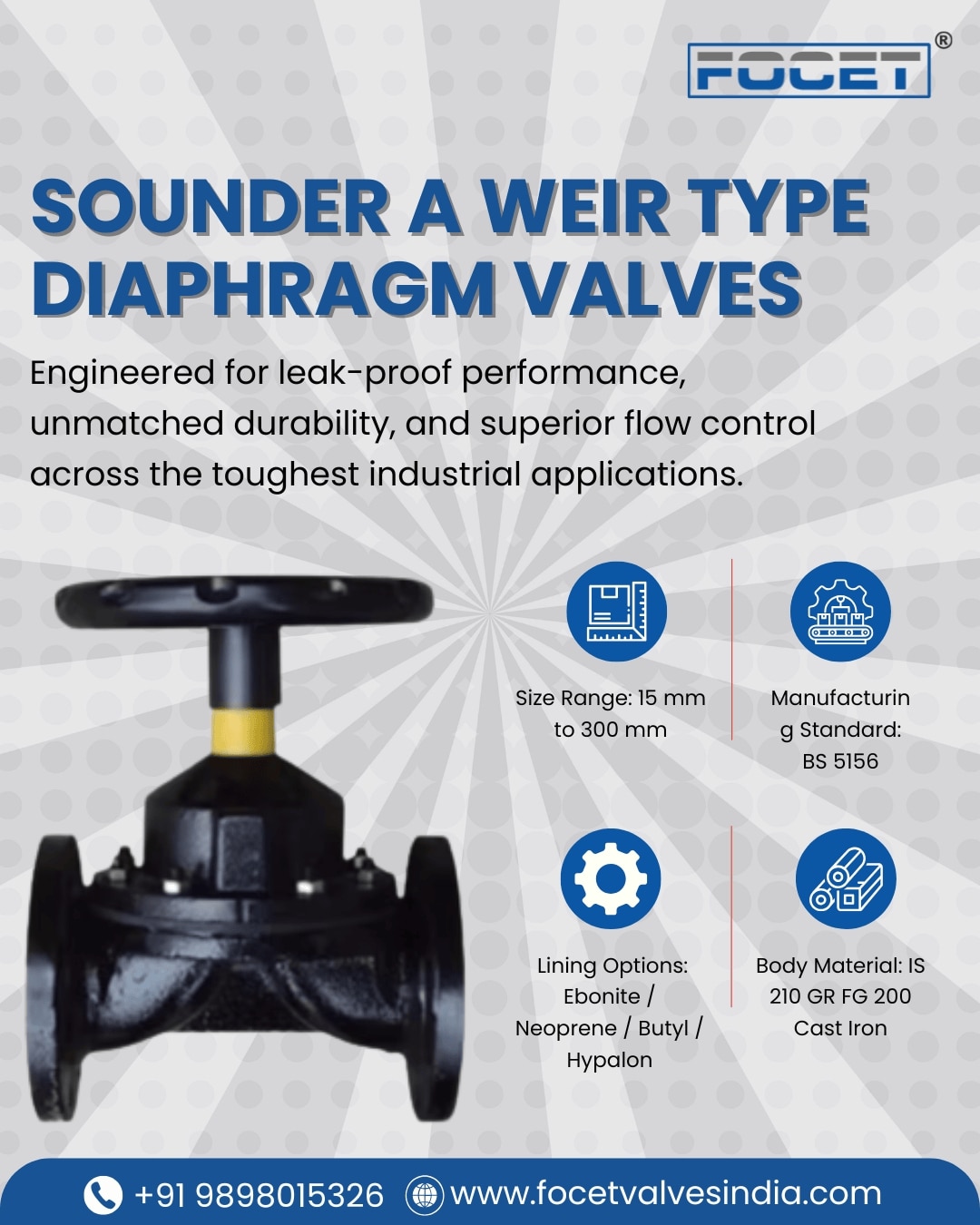 Focet Valves Pvt Ltd is a trusted name in industrial valve manufacturing, offering the Sounder A Weir Type Diaphragm Valve Manufacturers in Ahmedabad —a high-performance solution engineered for demanding process applications. Designed for precision, durability, and reliable flow control, this valve is ideal for industries requiring robust and efficient diaphragm valves.